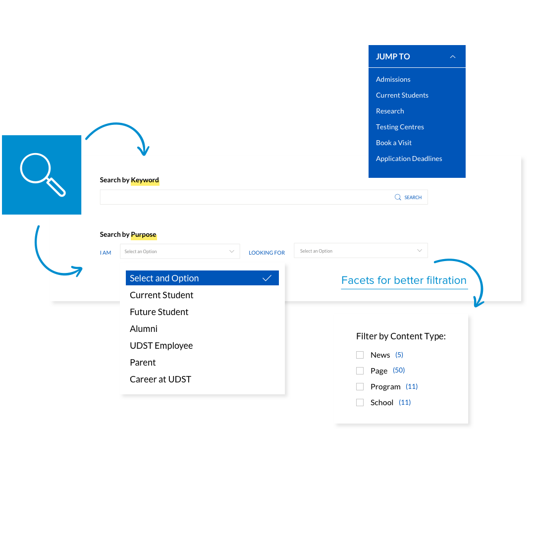 The UDST site caters to six unique user groups, so it is pretty content heavy. An important part of a good user experience is custom content that is easy to find. To make relevant content quick and easy to get to, Vardot implemented Solr Search, a hyper-fast, full-text search platform.