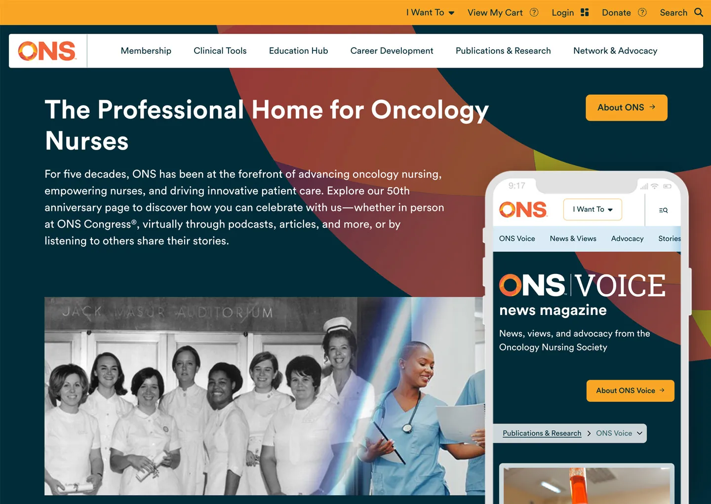 Oomph partnered with the Oncology Nursing Society (ONS) to unify three fragmented websites into a single, streamlined digital hub for the oncology nursing community. By redesigning content architecture, optimizing clinical tools, and implementing Algolia-powered search, we made essential resources easier to access. The new WCAG-compliant Drupal site enhances usability, supports institutional memberships, and ensures nurses can quickly find evidence-based care resources β anytime, anywhere.