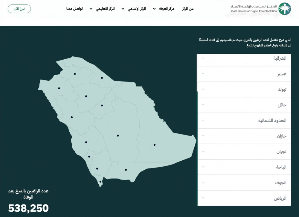 Implement an interactive map on the website integrated with the Tawakkalna application. This map displays the number of donors from various governorates within Saudi Arabia, with real-time data updates to ensure accuracy and transparency, and to encourage people to register and donate their organs.