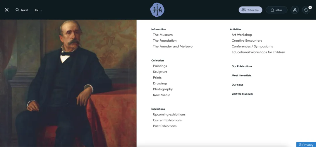 The website is equipped with a Virtual Tour button that provides the visitor with the opportunity to wander through the exhibits and an online store where one can purchase the items that are available in the Museum's physical shop.
