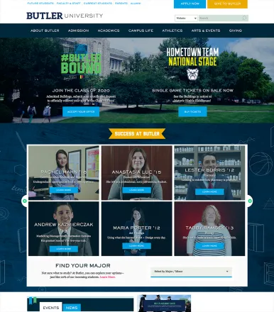 Butler is a 4 year private university located in Indianapolis, Indiana. Founded in 1855, it is best known for its academic excellence and the success of their men’s basketball team. When it was time to redesign their primary website, Butler was seeking a strategic approach to attracting top prospective students, increasing enrollment, engaging with current students, and streamlining the donation process.