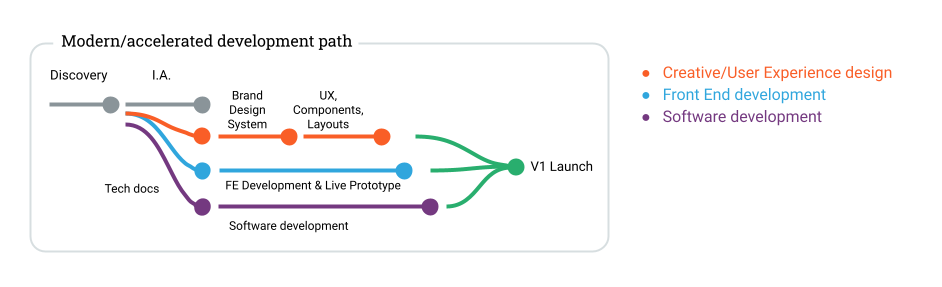 When adopting an accelerated development path, work is done on multiple fronts simultaneously, dramatically shortening the time it takes to deliver a website.