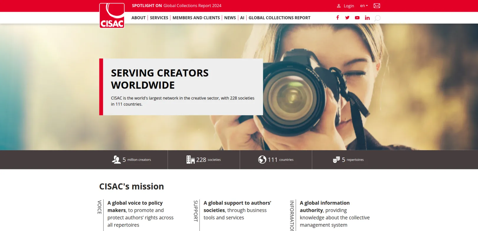 CISAC (International Confederation of Societies of Authors and Composers) is the world’s leading network of authors’ rights societies, dedicated to protecting the rights and promoting the interests of creators across the globe. Founded in 1926, CISAC represents over 230 collective management organisations in more than 120 countries, spanning music, audiovisual, visual arts, drama, and literature.