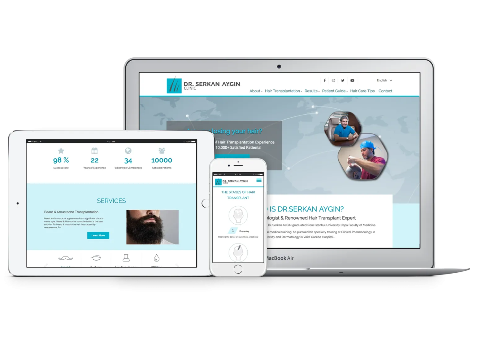 The user interface for the Dr. Serkan Aygin Clinic website was redesigned from scratch. The new interface was planned, first and foremost, with user experience in mind. A modern reality is that mobile web users outnumber their desktop counterparts. To maximize user experience, a mobile-first approach was adopted in the implementation of the Clinic website. This approach constituted a clean break from the antiquated model of first creating the desktop UI and later somehow fitting the interface on mobile devices.