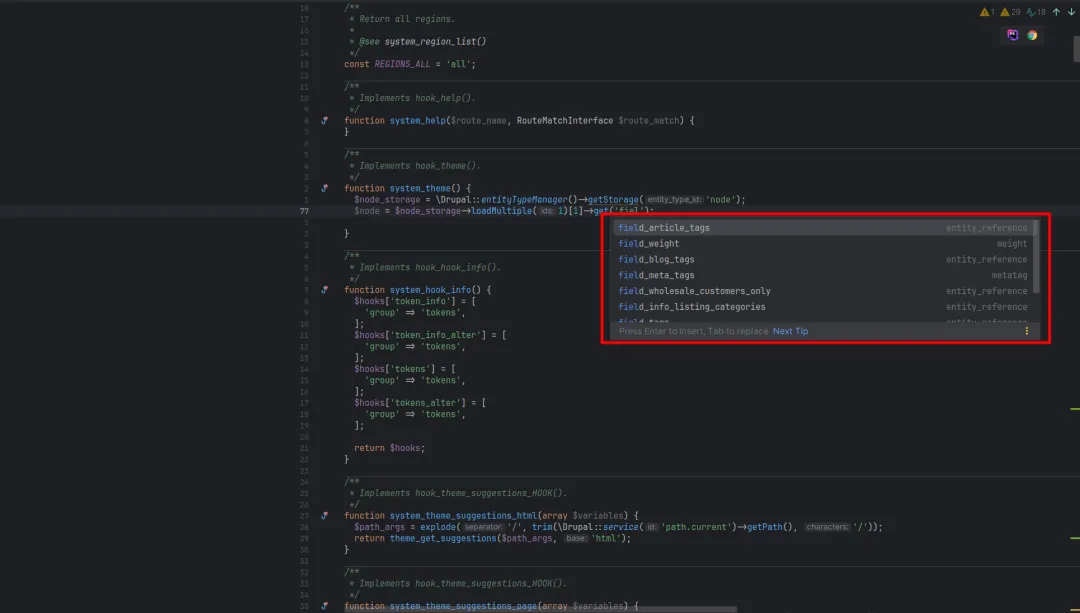 Autocomplete for Various Drupal Elements: The plugin should offer autocomplete suggestions for a wide range of Drupal elements, including storages, fields, field properties, theme, render elements, and their properties. This feature will significantly speed up the development process by reducing the need to manually type out Drupal-specific code.