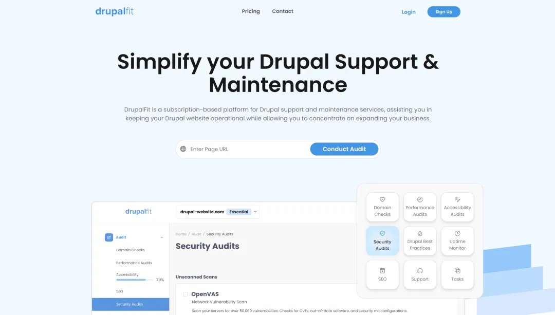 DrupalFit is a next-generation platform that empowers organizations and individuals to assess and improve their Drupal-based websites through audits, SEO analysis, accessibility checks, and membership-driven insights. Built as a decoupled system, DrupalFit leverages Drupal as its robust backend, with Next.js powering the frontend, and a suite of microservices (Node.js, AWS Lambda, and third-party APIs) handling complex tasks like SEO and accessibility audits.