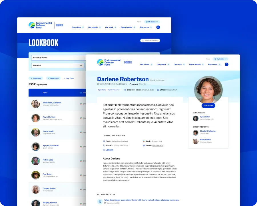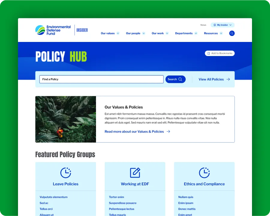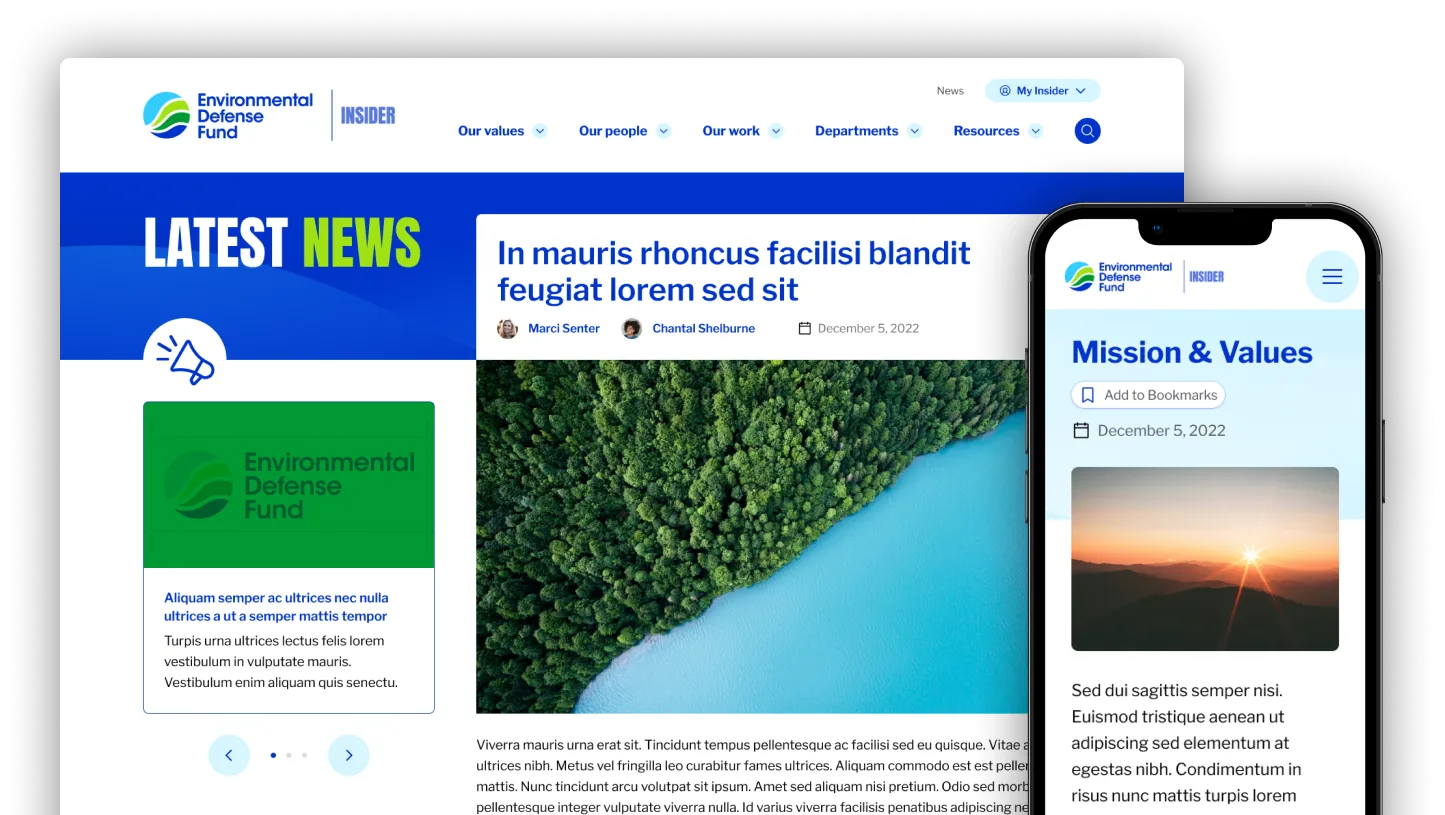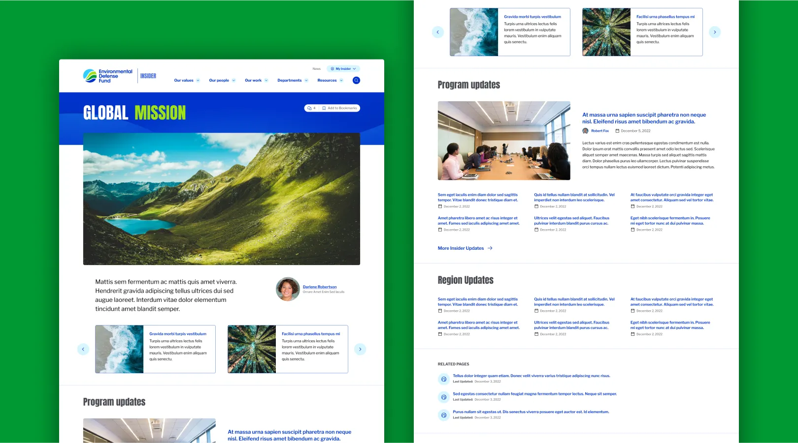 The reimagined EDF Insider features a homepage brimming with handpicked internal updates, global environmental news, highlights the staff doing the work, includes an enhanced directory, browsable and searchable content hubs, and an updated look and feel that aligns to EDF’s external websites.
