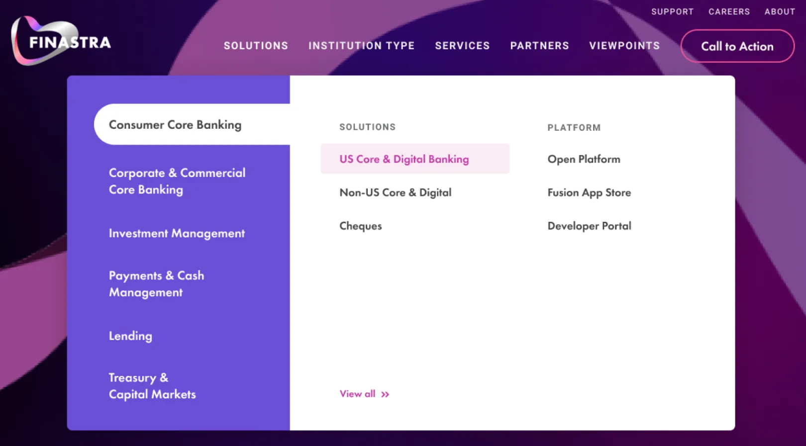 With a footprint and product portfolio as vast as Finastra’s, it’s easy to let buckets and silos define a site’s navigation. But Finastra believed in the power of simplicity, and so do we. Our challenge was to see just how far we could go paring down the navigation while still communicating all that Finastra does.