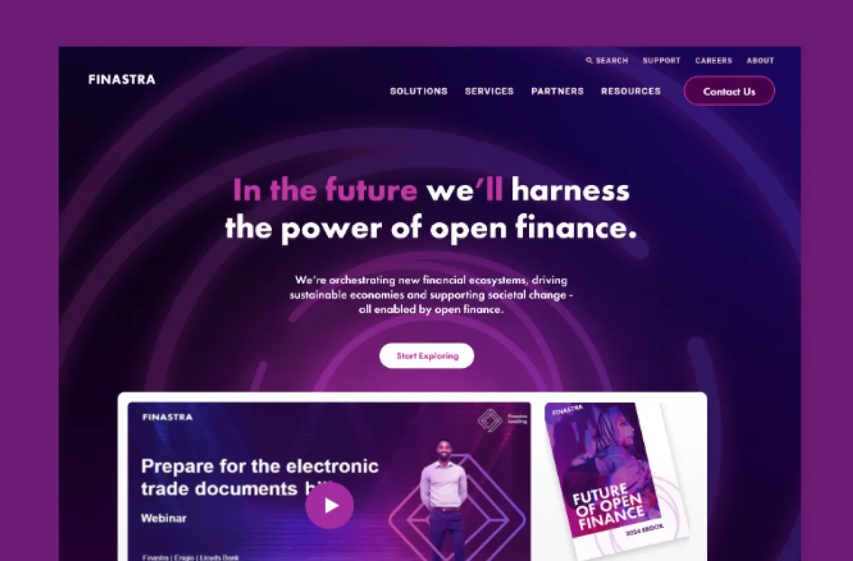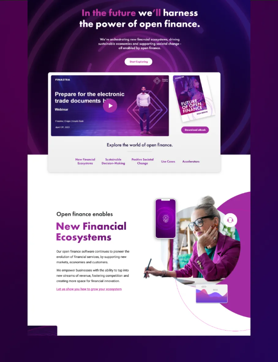 Finastra needed to create a digital hub for its thought leadership content, including dynamic video on open banking insights and trends. This hub aimed to enhance user engagement and support concurrent Open Finance campaigns by offering advanced UX and design capabilities to capture and convert users effectively.
