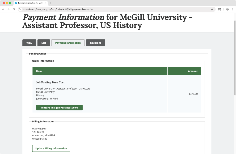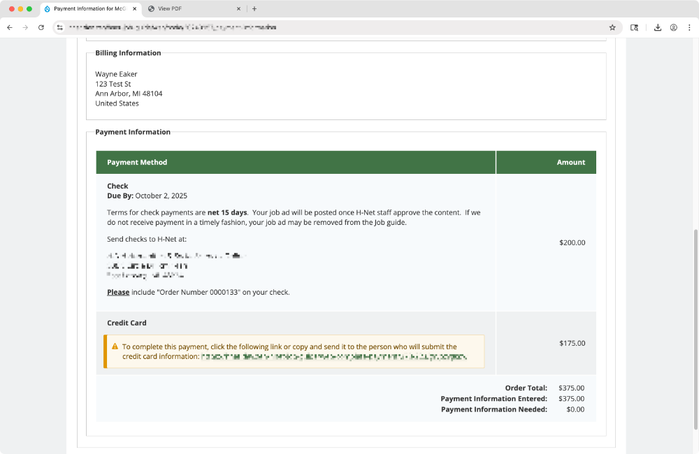 After submitting their order, job posters get a custom invoice with instructions based on their payment methods. Credit card payments can be completed online, using Drupal Commerce's checkout workflow.