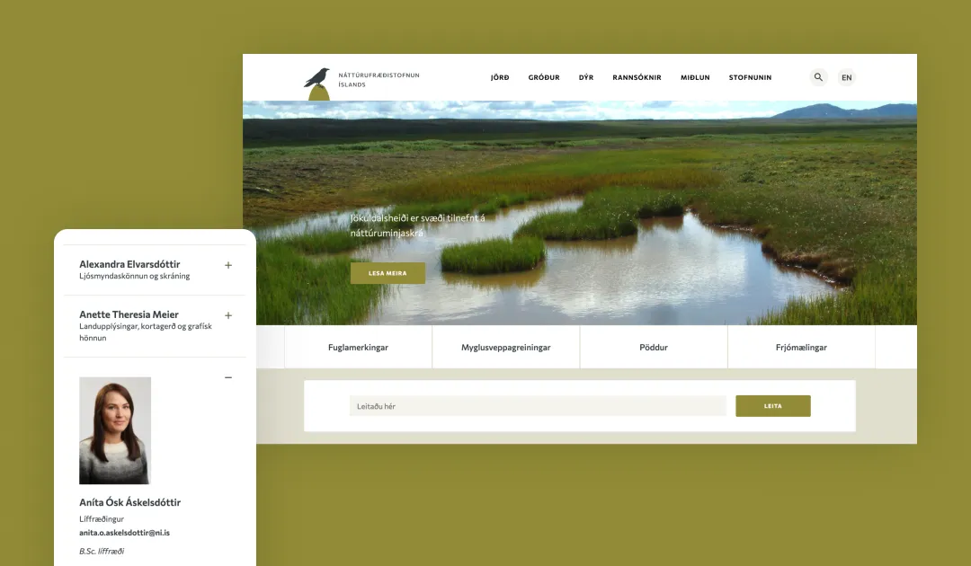 The Icelandic Institute of Natural History (NÍ), an agency of the Ministry of the Environment, Energy and Climate oversees the research and monitoring of Iceland's natural environment. The NÍ website was based on Drupal 7 and needed upgrading to Drupal 9. NÍ used this as an opportunity to improve the system to provide a more user-friendly and accessible experience. This involved implementing a modern design and enhancing the search functionality to make the information about Iceland's natural environment more accessible to users.