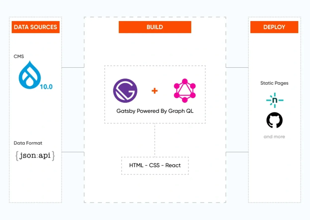 A decoupled architecture with Drupal 10 and Gatsby was selected. This was primarily driven by Drupal's flexible integrations and content creation features, alongside Gatsby's performance optimization, powerful UI creation, and security benefits.