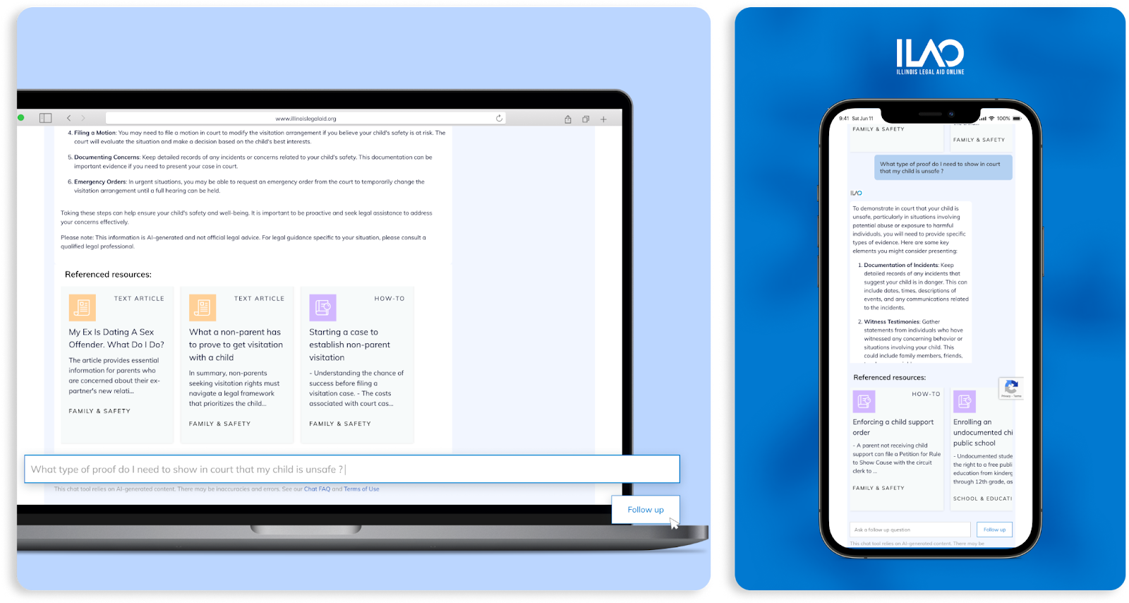 Both tools provide general legal information to Illinois residents. The work resulted in more users being served and a shift in how they interact with legal information: more guided, consistent, and aligned with how people naturally ask for help.