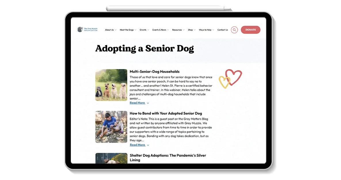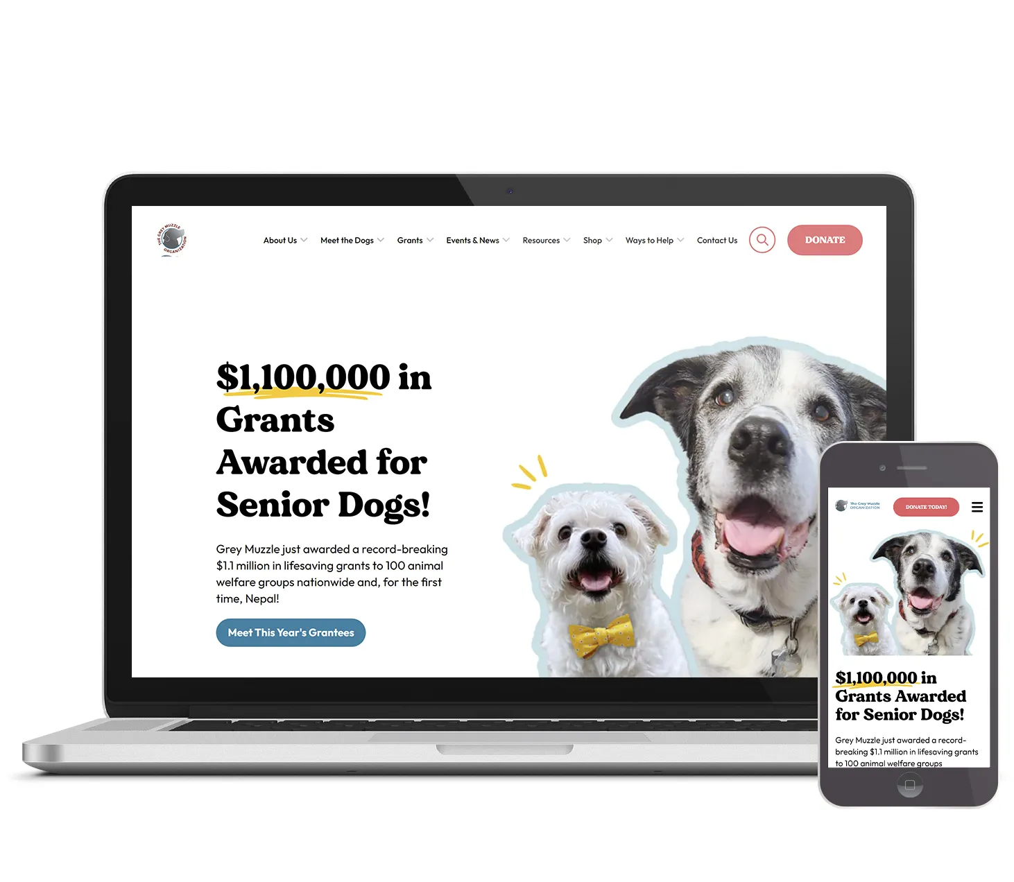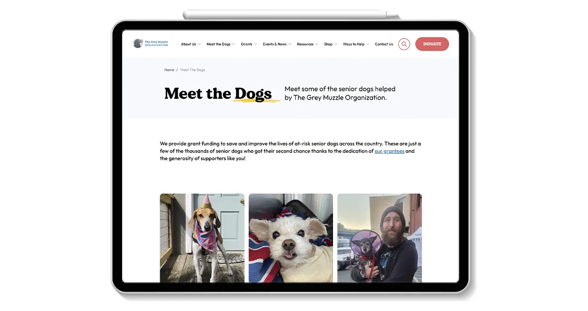 Grey Muzzle wanted their website to better communicate their mission in terms of User Experience and overall look and feel. They were also looking to upgrade their Drupal 9 website to Drupal 10. The website had critical bugs from a previous migration that hurt performance and user experience.