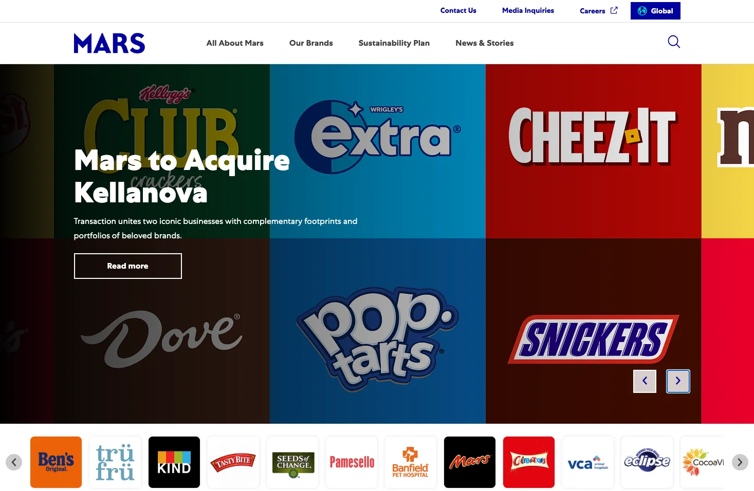 This project stood out due to its innovative "starter kit" approach, which centralized essential features such as navigation structure and content localization across Mars properties. By leveraging a shared, configurable theme and a robust set of building block components like carousels and newsletters, the project balanced individual brand identities with a consistent structural framework.