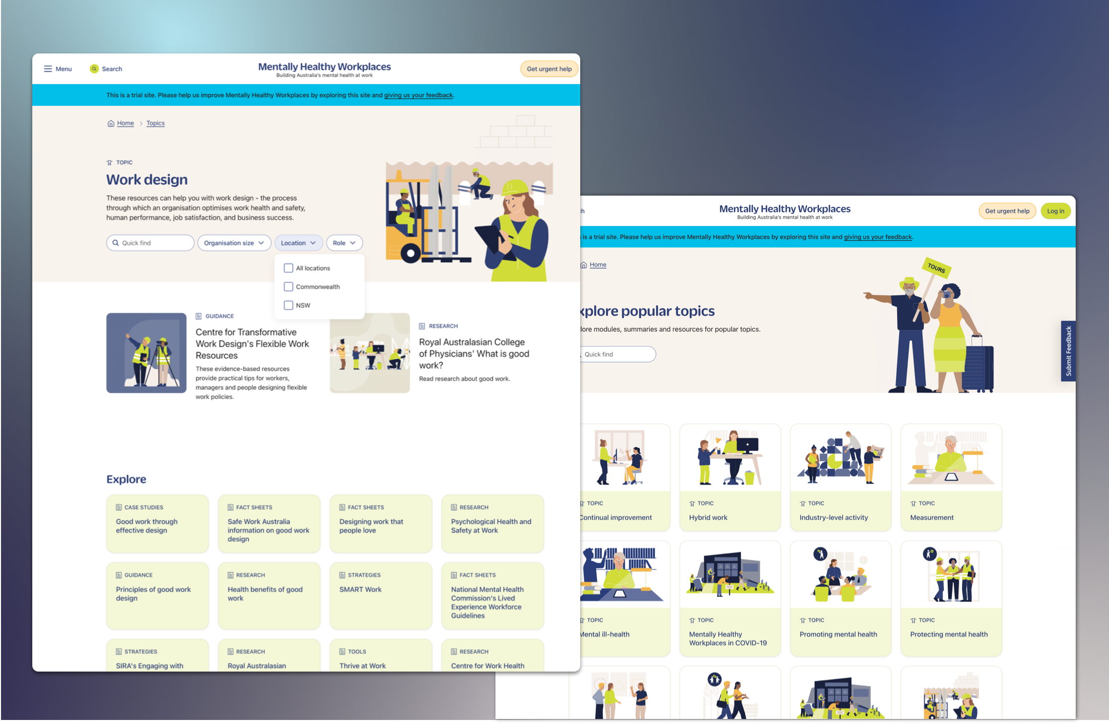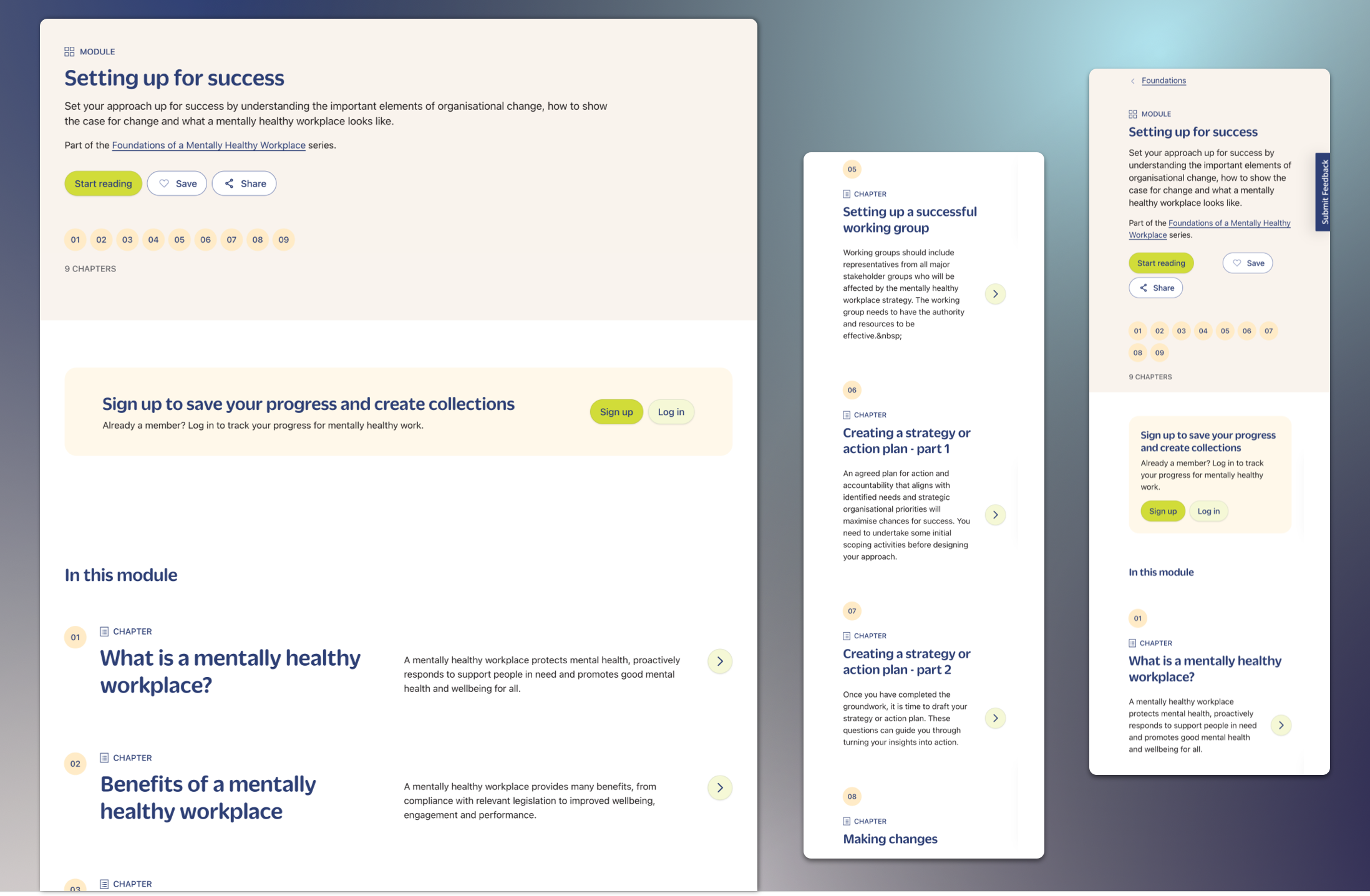 The Mentally Healthy Workplaces platform allows users to create " MyHub" accounts using Drupal User Account Management. The project took a highly customised UX approach to create accounts for the different types of users targeted by the platform.