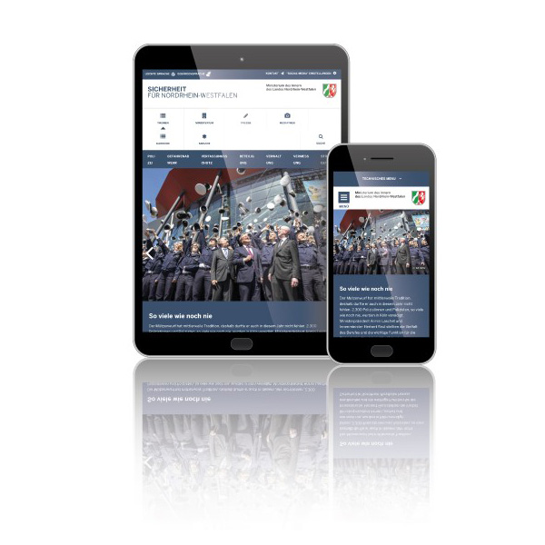 Being the first major website built with nrwGOV, the website for the Ministry of the Interior mainly relies on the core functionality provided by the distribution. It has also benefitted greatly from the ongoing development of nrwGOV over time, gaining new features like responsive videos, time-controlled teaser references, and in-depth theme customization.