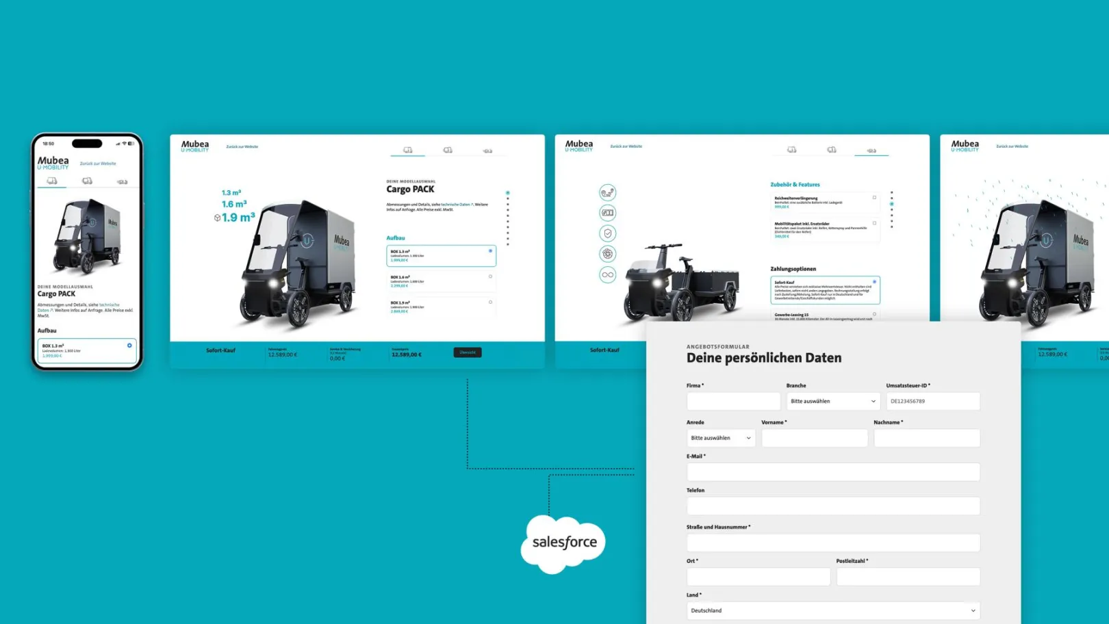 The configurator was implemented as a React application (headless) and receives the data from Drupal via a REST interface. At the end of the configuration process, the website transfers the information and user data to Salesforce. The Salesforce connection is also relevant in the area of lead generation and was seamlessly integrated into the front-end design of the website so that there are no breaks in the user journey.