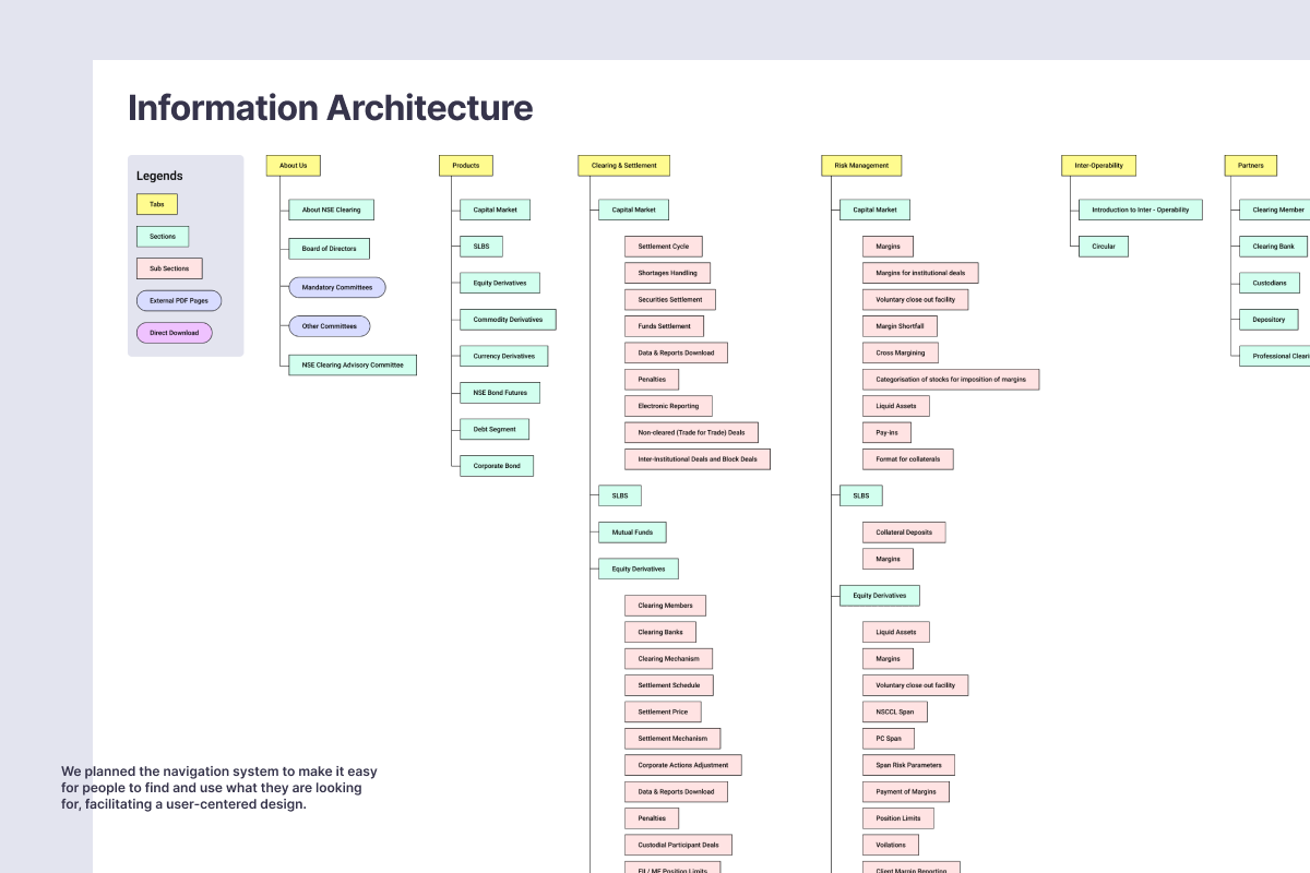 We enhanced the NSE Clearing website’s content architecture to enhance usability, findability, and discoverability of relevant information with a UX-design-led IA. We planned the navigation system to make it easy for people to find and use what they are looking for, facilitating a user-centered design.