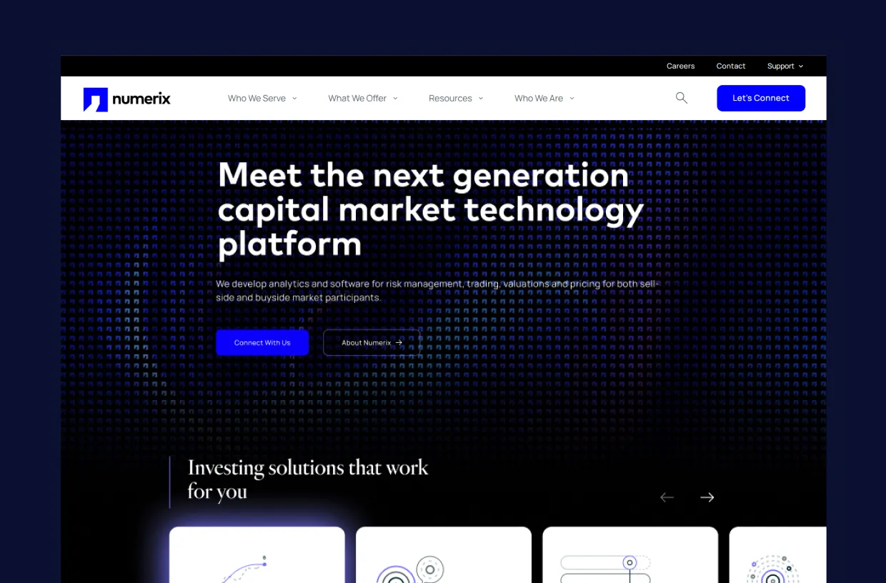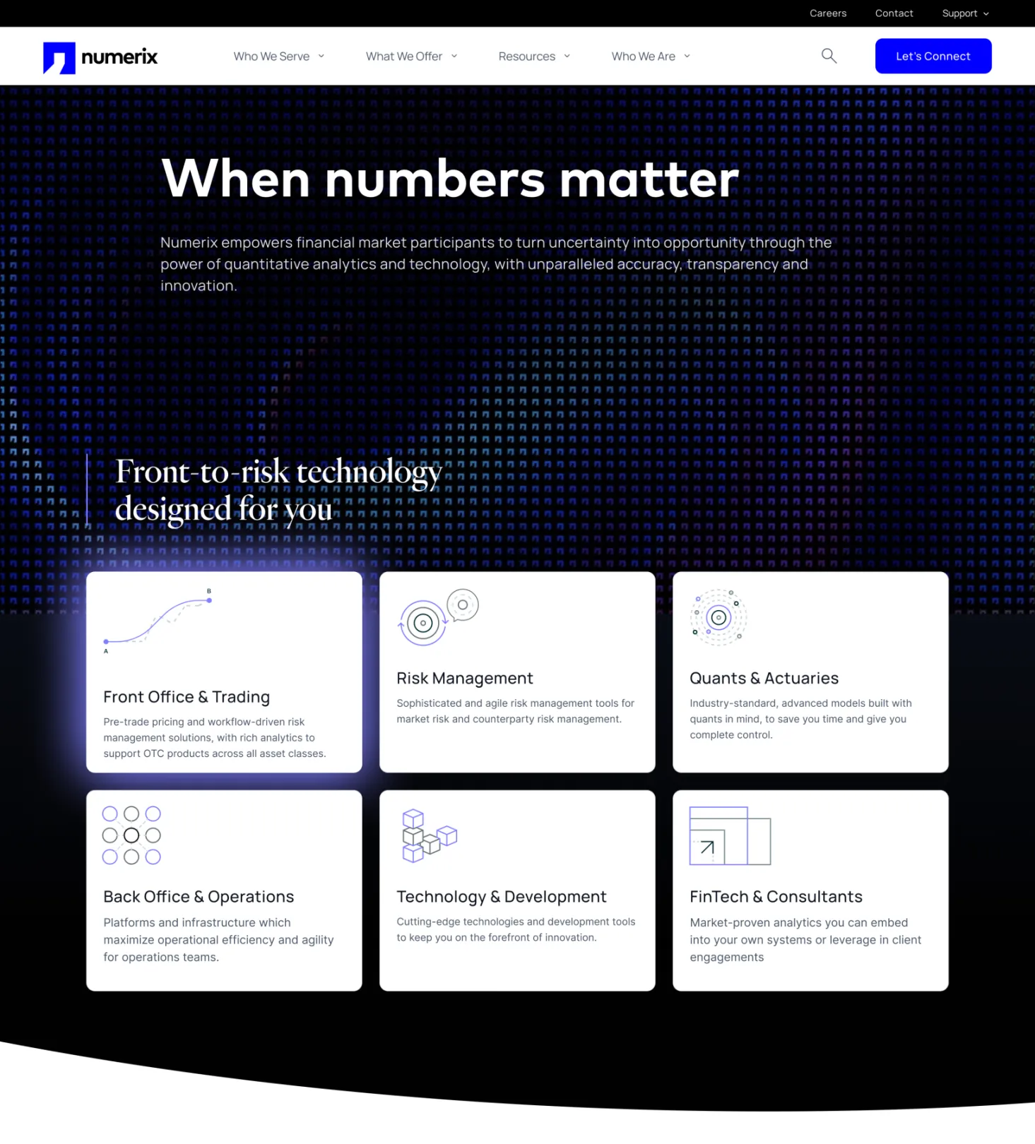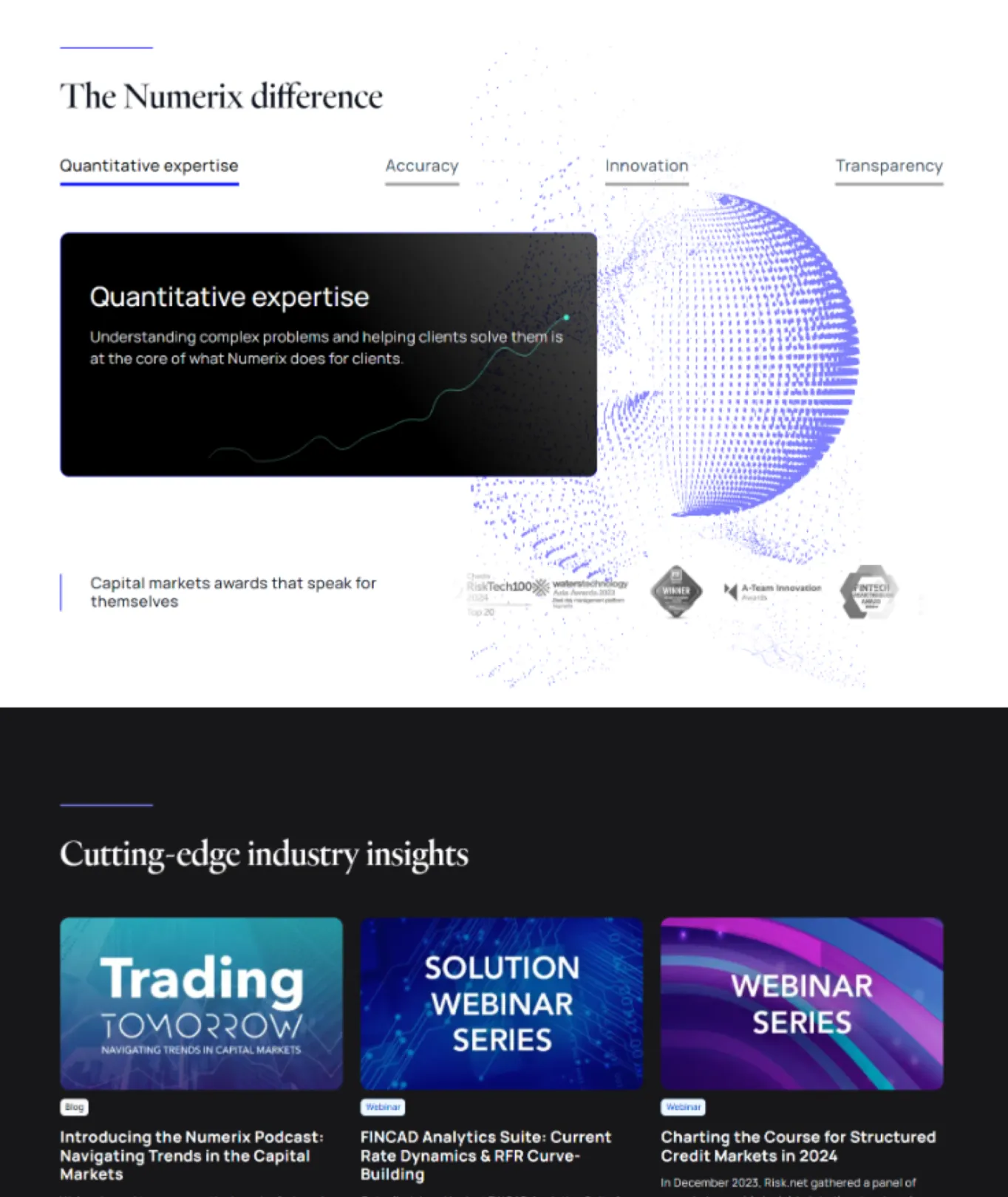 First impressions still matter—and Numerix needed to give new site visitors the right impression from the jump. A system of stylish content blocks balances content and visual impact resulting in increased brand clarity, and a deeper experience that resonates with users.
