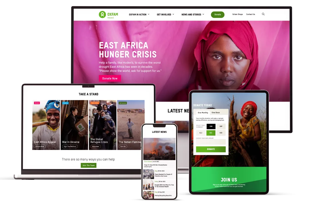 As part of Oxfam Ireland's fundraising efforts, the integration of donations and CRM was a key priority for the new website. By seamlessly connecting the website with Oxfam Ireland's donation system and their customer relationship management (CRM) software, we created a streamlined user experience for those looking to support the organisation. The website not only makes it incredibly easy for users to donate but we also simplified the process of signing up to volunteer or receive newsletters.