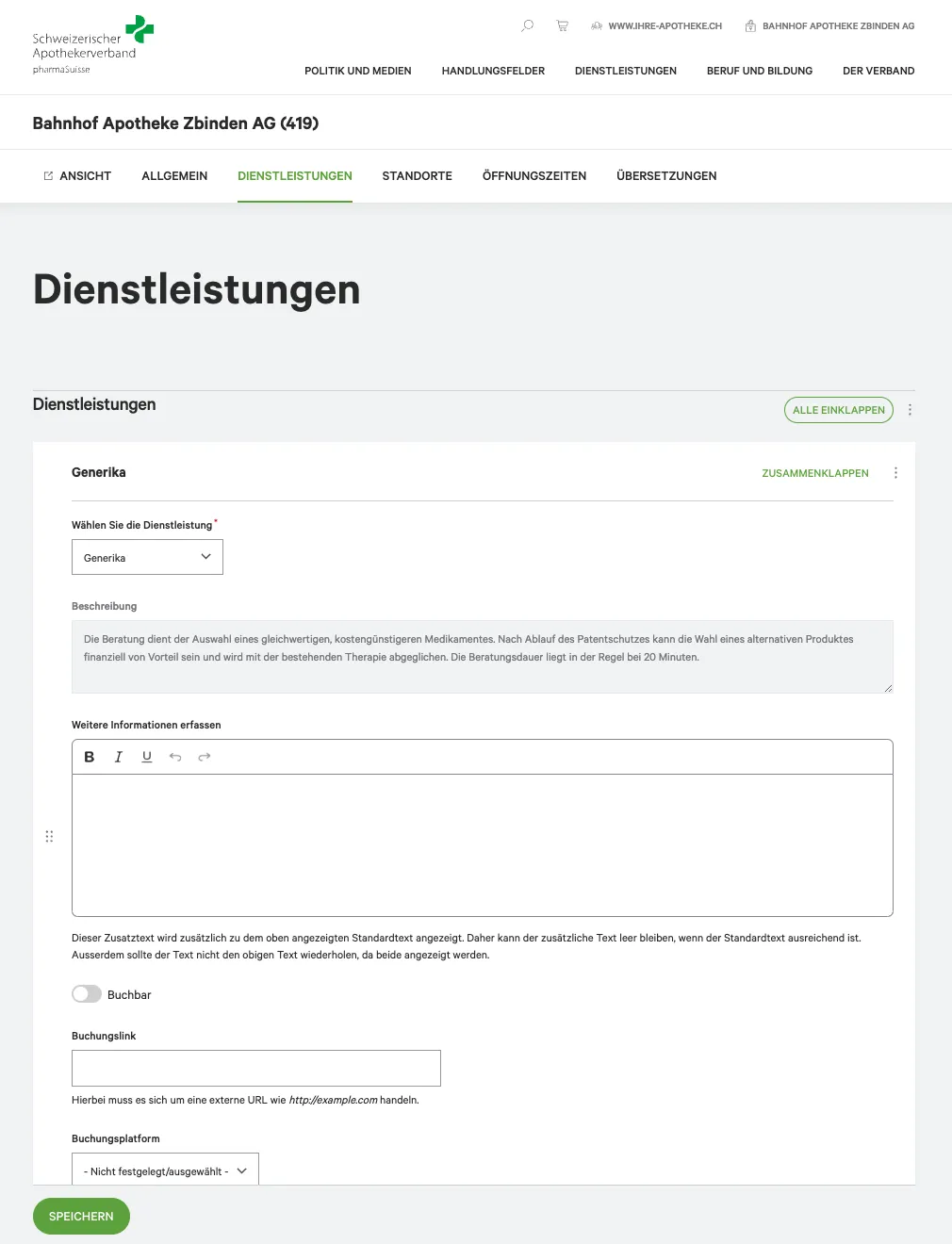 The system seamlessly integrates different online presences with a multi-site and multi-domain approach. Editors usability would be significantly improved using the open source editor blökkli. The pharmaSuisse back office benefits from flexibly customizable backend views that simplify the administration of users and pharmacies.