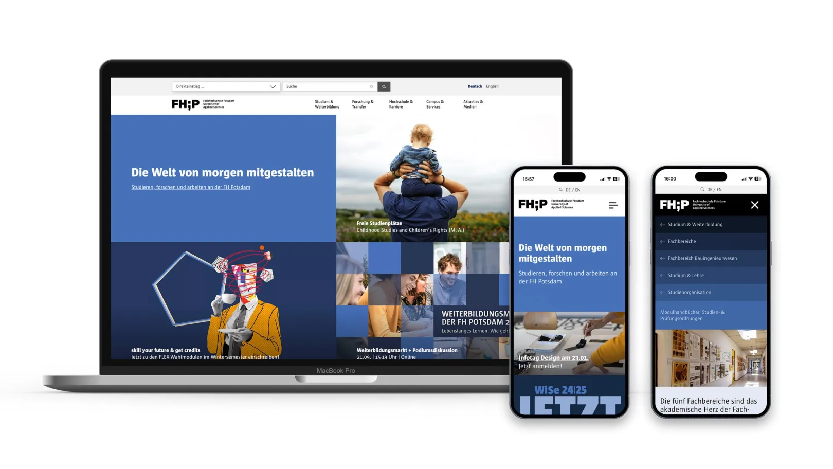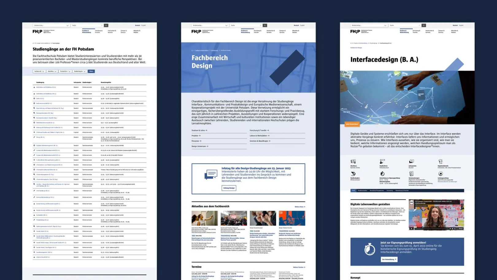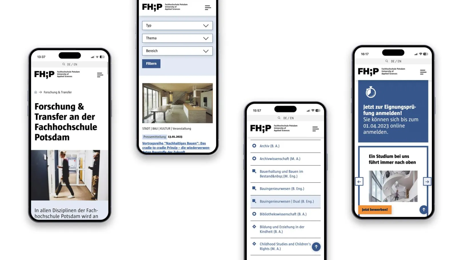 Relaunch of the central website of the Potsdam University of Applied Sciences for different user groups: prospective students, the public, companies, research organisations, students and university members. The website is a contact point, a comprehensive information portal, an online resource and a working tool for university members - in some cases with restricted access.