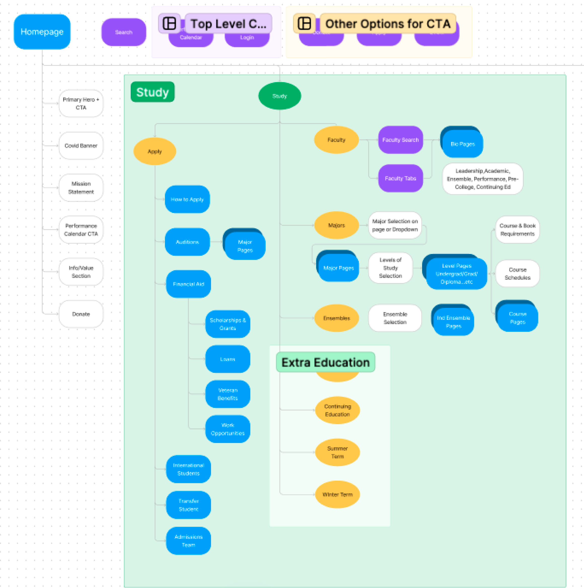 Content was reviewed for key messaging around their state of the art facilities, large community, and the school’s desire to support each student’s goal of becoming a successful musician. It was determined that action-based headings with concise copy using current language and words would best resonate with and engage students (for example: Study, Learn, Play). Copy used elsewhere was reworked to better reflect the SFCM’s bold and joyful personality and use current, more concise language to engage future students.