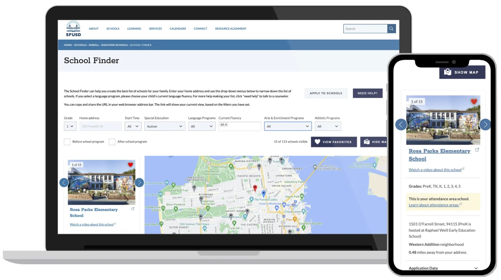 SFUSD needed a tool that would allow parents to easily research and compare schools on their own without requiring in-person assistance. They turned to Kalamuna to build them a "School Finder," a user-friendly tool that could be integrated into SFUSD’s existing Drupal 8 website that would empower parents to confidently select schools while also reducing the support burden on the school district.
