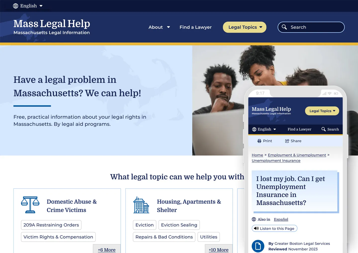 Mass Legal Help (MLH) is a website dedicated to supplying trustworthy information about legal issues throughout the state of Massachusetts. They provide easy to understand and easy to find resources for those who might be stressed and surprised by a legal notification. Its parent organization, the nonprofit Massachusetts Law Reform Institute, needed to modernize the site to increase usability, navigation, and accessibility. Oomph was ready to discover, strategize, and redesign the entire experience from architecture and taxonomy to page designs and safety features.