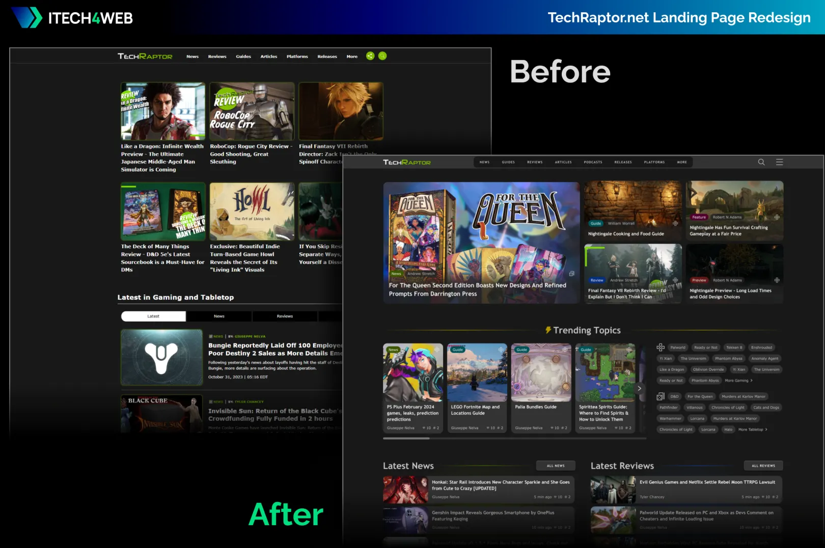TechRaptor celebrated its 10th anniversary in 2023 as a go-to site for gamers to get news, reviews, interviews, and guides to both video and tabletop games. With a staff of over 10 devoted writers, Rutledge Daugette, the founder and leader of the TechRaptor team, approached iTech4Web with several goals for the homepage and primary landing pages of his Drupal website.