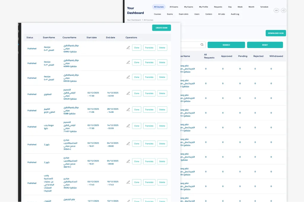 The new portal needed to function as a central system for exam booking and management—connecting multiple internal and external systems, supporting bilingual interfaces (Arabic & English), and delivering a seamless booking experience for students, coordinators, exam centers, and administrators.