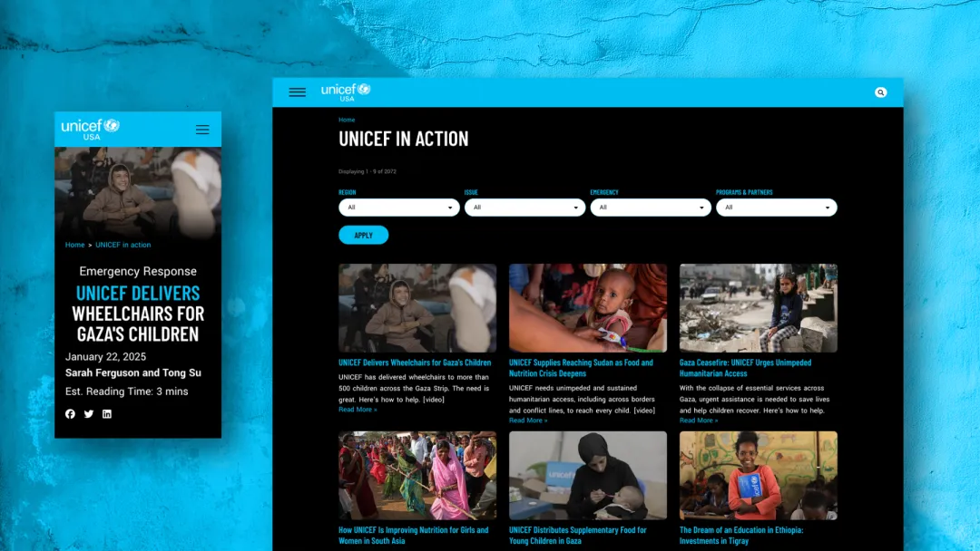 UNICEF USA is a national non-profit organization that works to advance the global mission of UNICEF by rallying the American public to support the world's most vulnerable children. With a new brand vision, messaging, and content that needed to reflect the updated experience, UNICEF USA partnered with Sandstorm to build a new digital experience in Drupal via www.unicefusa.org that better conveys the organization's impact worldwide, while driving donations to improve the lives of children.