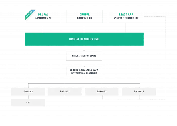 The Dropsolid strategists and Touringâs team set to work on a Drupal-orientated architecture. They decided to build a new corporate website and build the entire Drupal 8 environment using a so-called decoupled architecture. This would allow Drupal to act as the middleware that could integrate all of Touringâs existing applications.