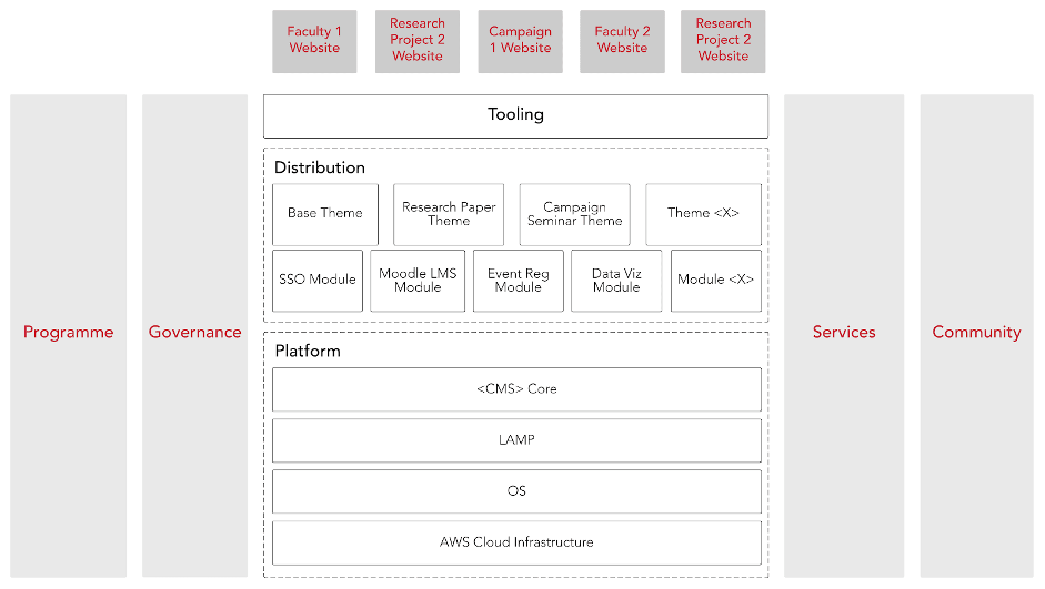 Over the years, the number of websites had grown organically. In fact, the university had over 25 websites on three different content management systems (CMSs), on different versions, on different infrastructures, and with different vendors. The sites had been built in Joomla, Drupal and WordPress, but different versions of these CMSs were running across the sites (e.g. there were sites on Drupal 6.x, Drupal 7.x and Drupal 8, and it was a similar story for Joomla and WordPress). This meant the sites were inconsistent, difficult to maintain, and it was becoming increasingly difficult to onboard new sites.