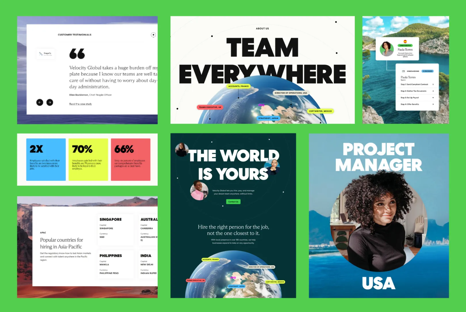 During discovery, we worked closely with visual design agency Red Antler to ensure the new Velocity Global identity would be brought to life in a consistent, engaging, and manageable way.