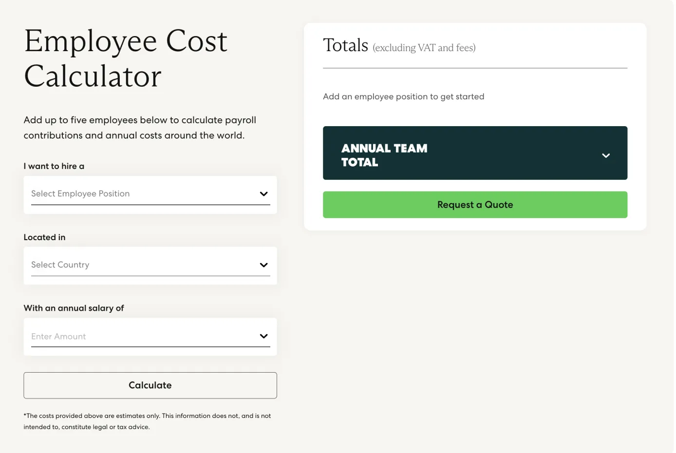 While every sales process is unique, there are some tried-and-true tactics that can often show value to potential customers. We helped build an employee cost calculator that helps prospective customers budget for hiring globally. The system pings a custom API for country and currency information using a fast, lightweight Javascript application. Follow-up CTAs funnel interested users directly into the sales process.